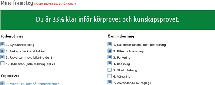 Tänkte bara berätta lite kort om vår nya funktion här på GratisTeori.se, vi kallar den för "Mina framsteg". Med "Mina framsteg" kommer man kunna hålla reda på hur långt man har kommit i körkortsutbildningen.