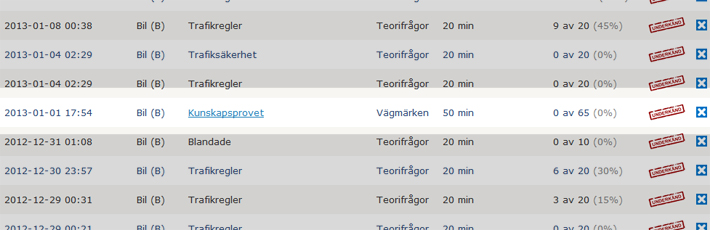 Varje gång du skriver ett "Kunskapsprov" på GratisTeori, sparas resultatet så du vid ett senare tillfälle kan gå in i statistiken och se över vad just du behöver träna lite extra på. Som du ser på bilden här ovan, går det att klicka på "kunskapsprovet". Här nedan ser du ett exempel på hur det kan se ut. Denna sida är även utskriftanpassad så du lätt kan skriva ut den och skicka som mail eller ge den direkt till den du övningskör med.
