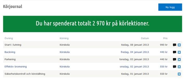 Det första du kommer se är denna vy, här presenteras den totala beloppet högst upp i mitten, direkt under det ser du en lista på övningar du har tränat på och ifall du har tränat på dem privat eller via körskolan. Du ser även priset samt vilket datum du övningskörde. Ifall du har lagt till en kommentar på en viss övning, kommer du se en svart pratbubbla till höger, placera musen över den så visas kommentaren.