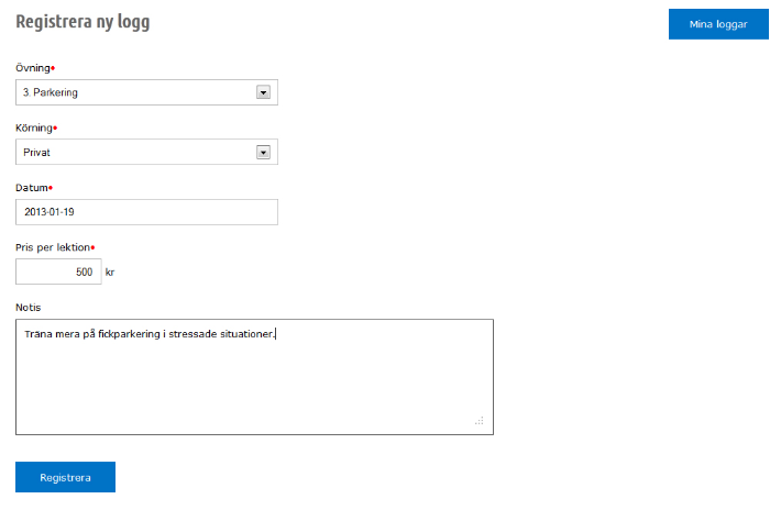 Fyll i alla fälten, alla fält är obligatoriska förutom "Notis"-fältet och tryck därefter på "Registrera". För att ta dig tillbaka, klickar du på "Mina loggar".