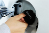 Tanklocket öppnas på olika sätt beroende på vilken bil du kör. Vrid sedan upp locket därunder. När pumpen är redo för tankning låter den lite, och du kan sätta in den i det lilla hålet i bilen. Sätt in pumpen så långt det går. Tryck på handtaget, och bilen tankas.